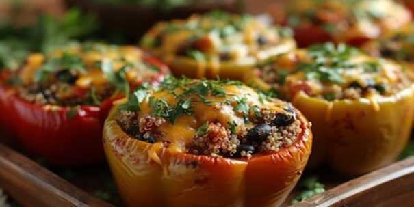 Quinoa has all the amino acids meat has. Add tomatoes and herbs for flavour. Each pepper gives you vegetables and grains in one serving.
